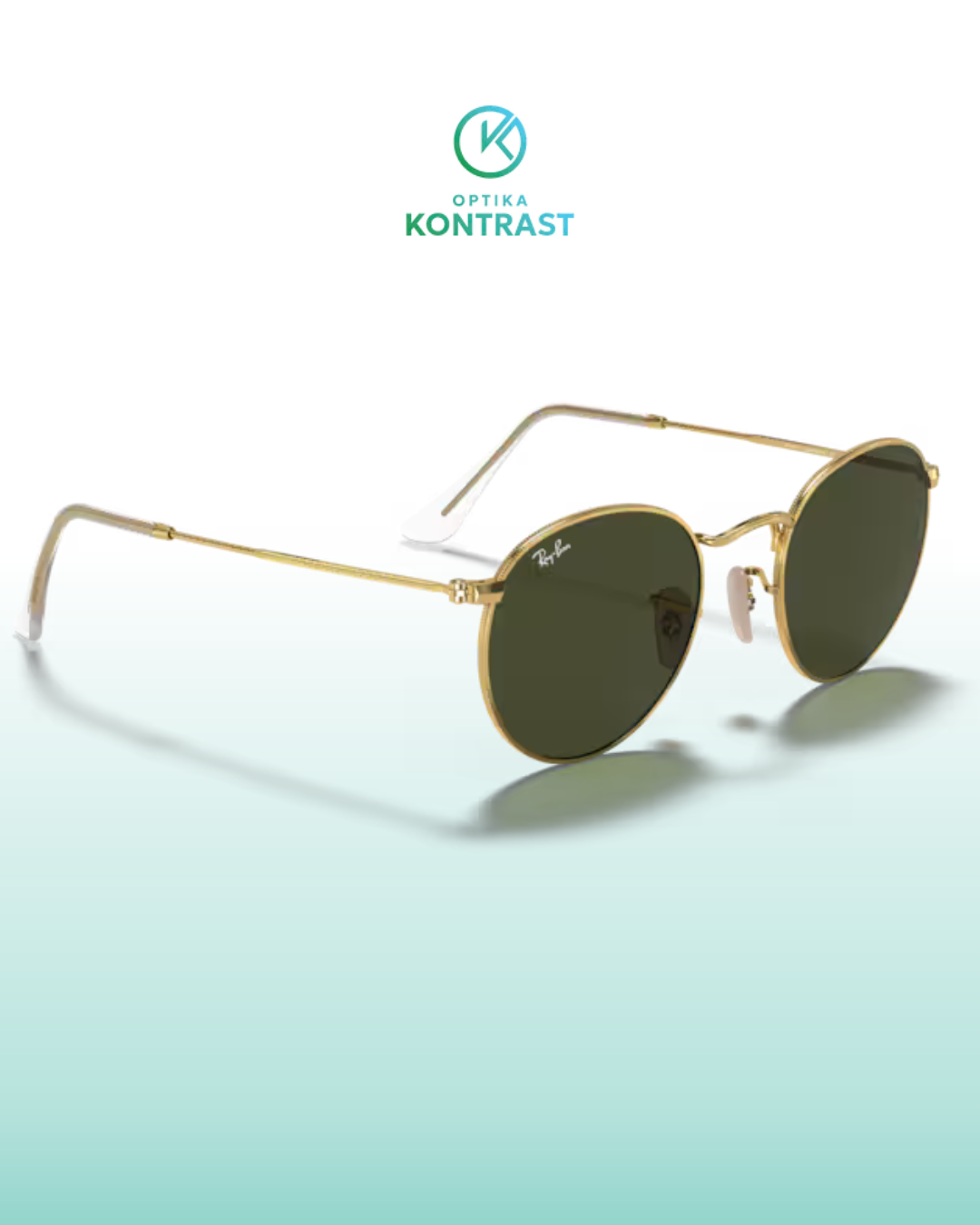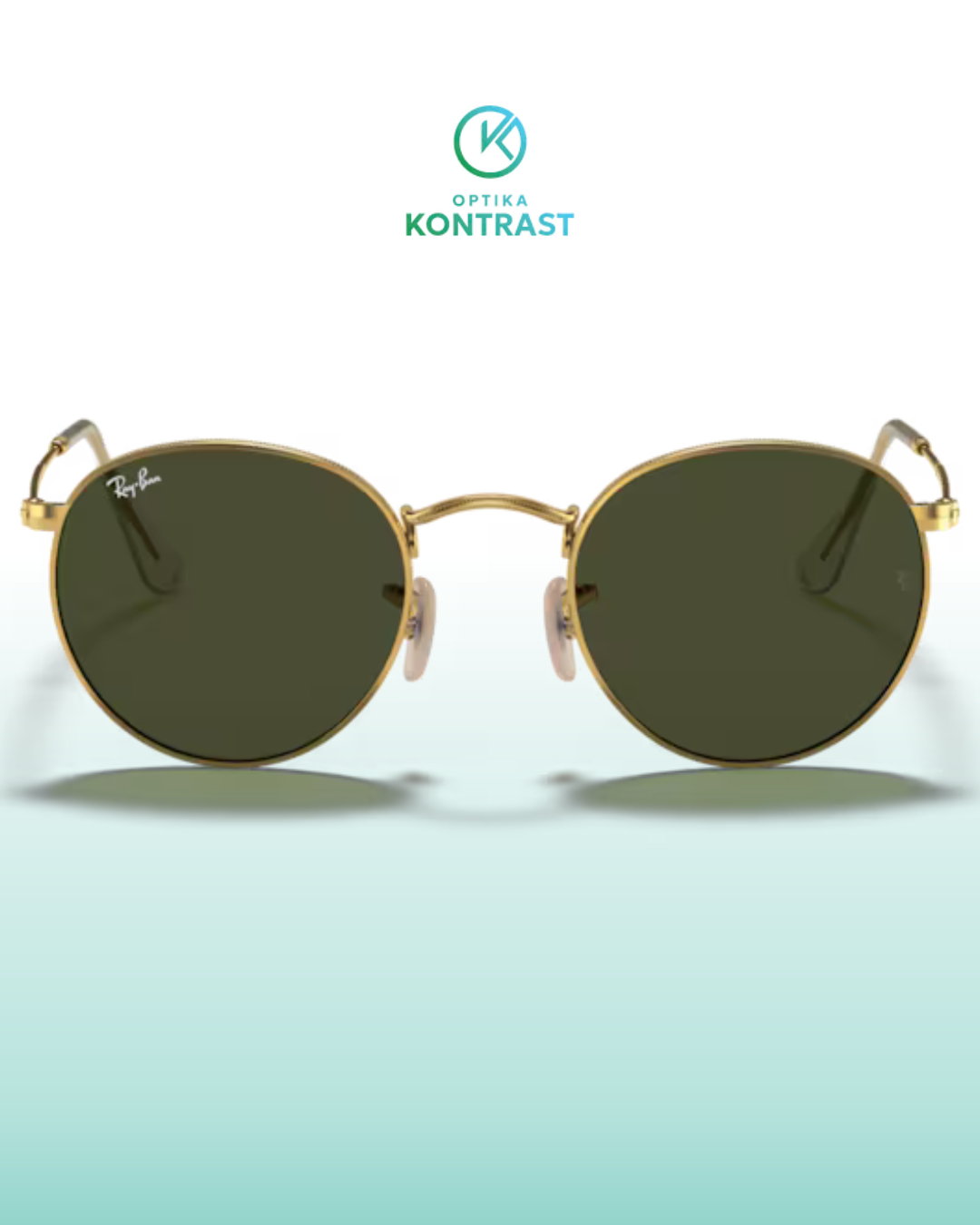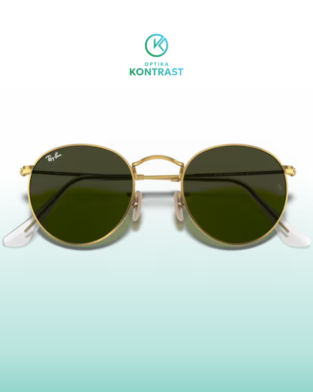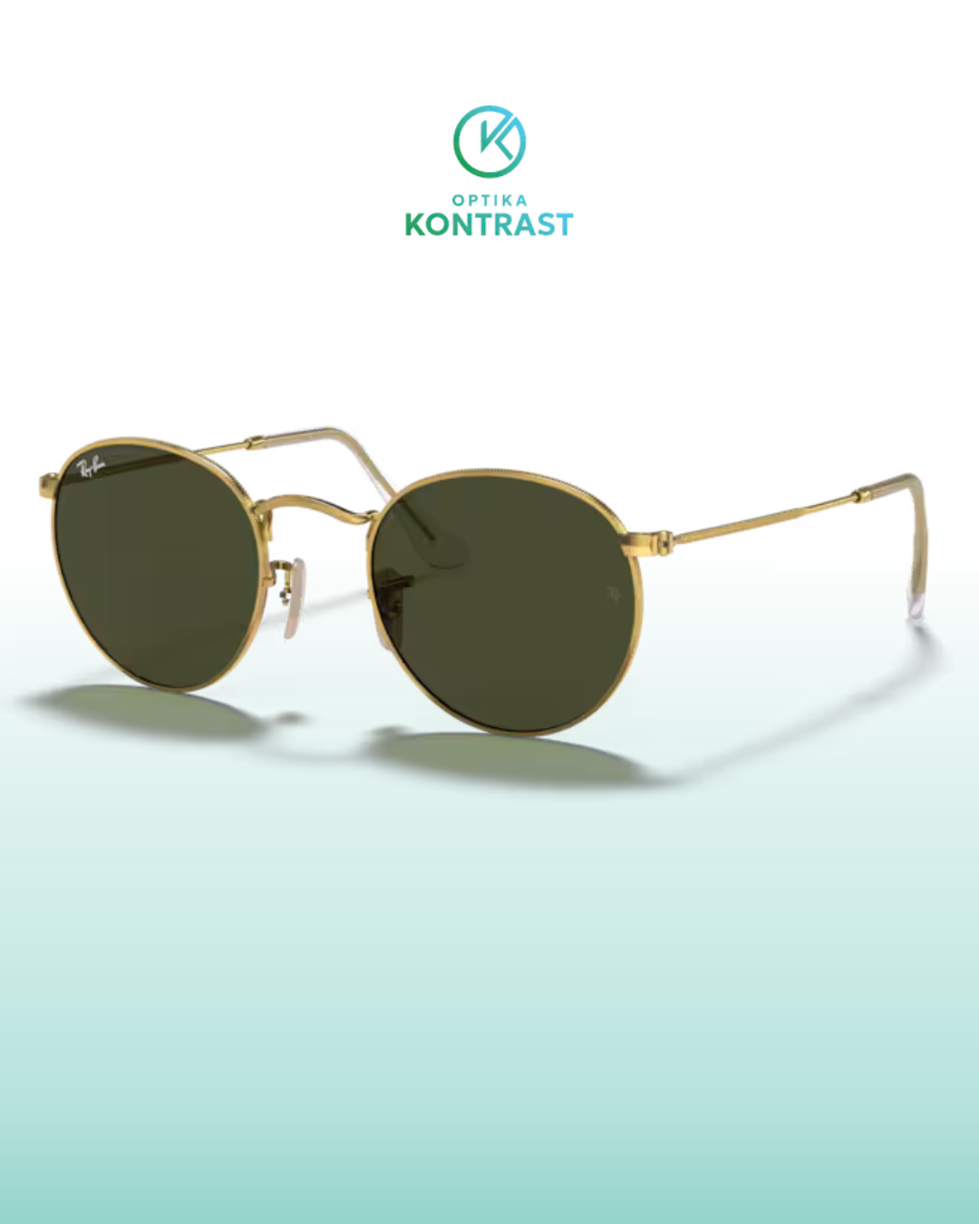 Ray Ban naočare za sunce, klasični okrugli model, sa tankim zlatnim metalnim okvirom. Elegantan retro izgled savršen za sve koji vole bezvremenski stil.